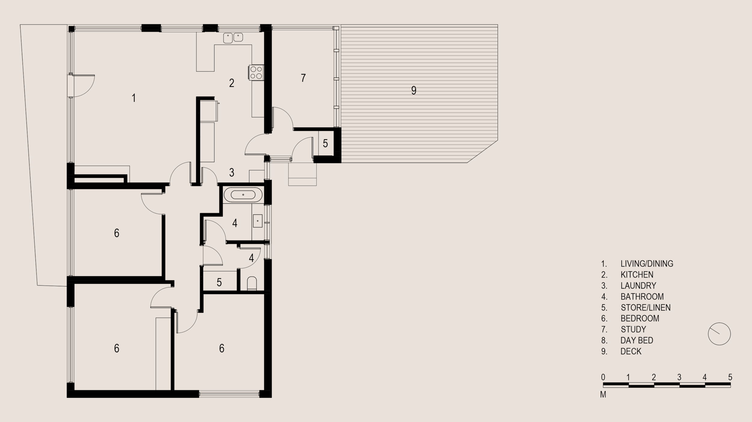 The day bed is positioned to frame views of the River Derwent and capture both morning and evening summer light, turning the kitchen into a secondary living area. An angled wall allowed us to form a small office nook with views over the garden and the northern valley. The original single bathroom was also reconfigured to form two bathrooms within the same footprint.